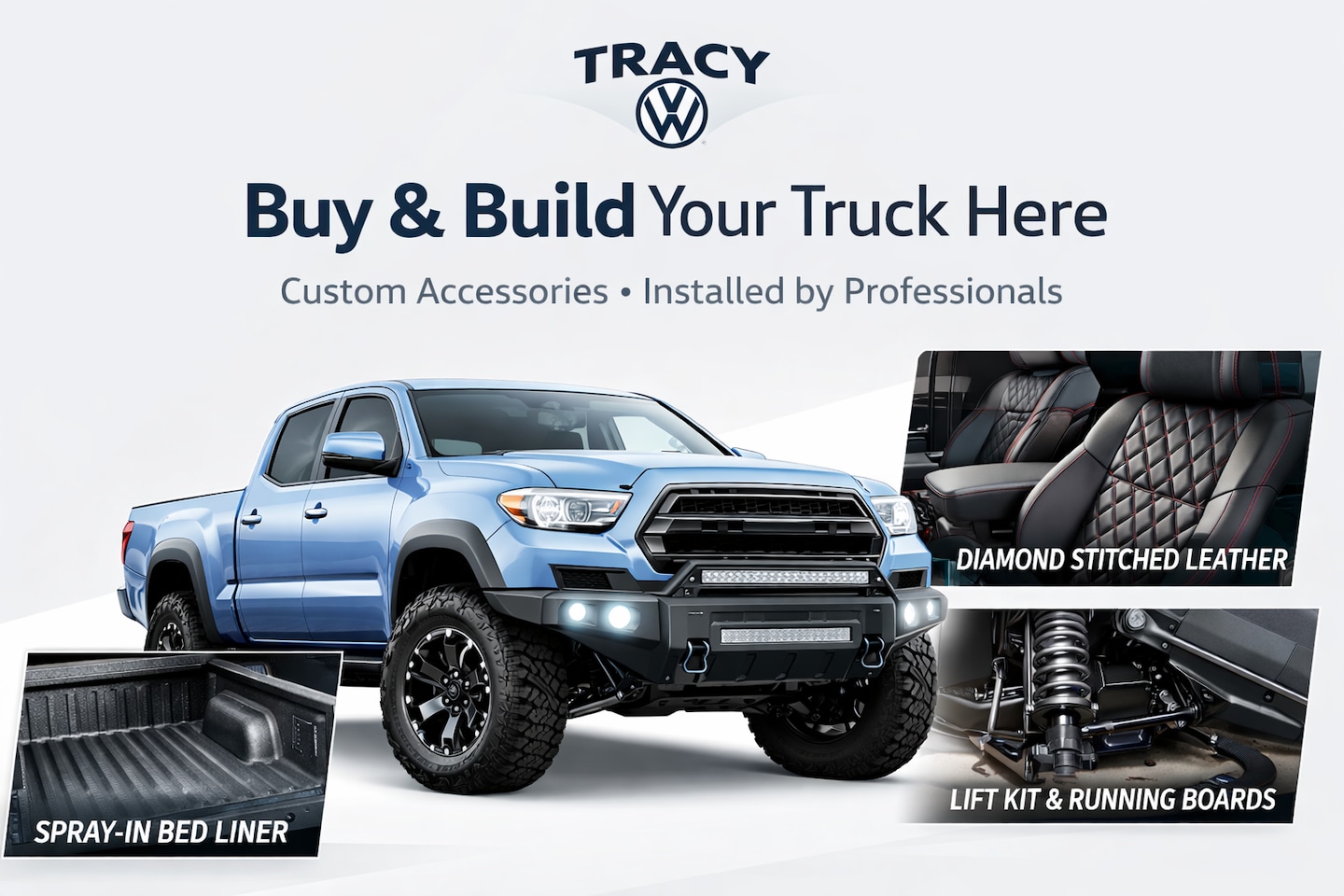 At Tracy Volkswagen, we make it easy to buy and build your truck exactly the way you want it. Choose your truck, then customize it with professionally installed accessories-all in one place. Our in-house experts offer premium upgrades including lift kits, running boards, spray-in bed liners, custom wheels/rims, and diamond-stitched leather interiors to enhance performance, protection, and style.